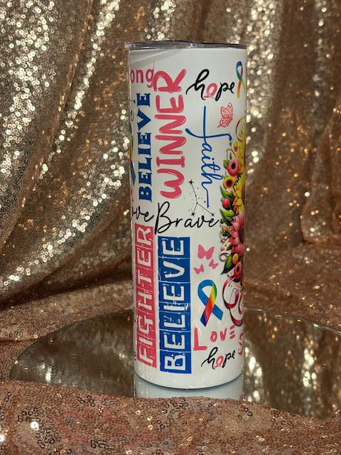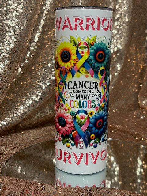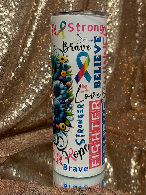 This 20 oz stainless steel tumbler features durable construction to keep beverages at the ideal temperature for hours. It includes a straw and a spill-proof top to prevent leaks and enhance convenience on the go. Designed with care, it also celebrates cancer survivors, making it a meaningful and practical choice for daily hydration.